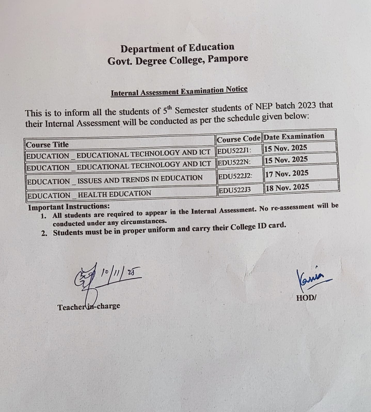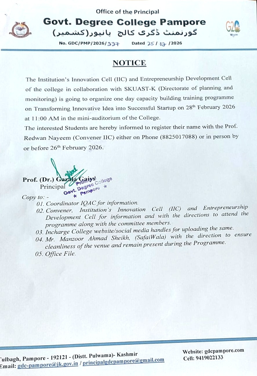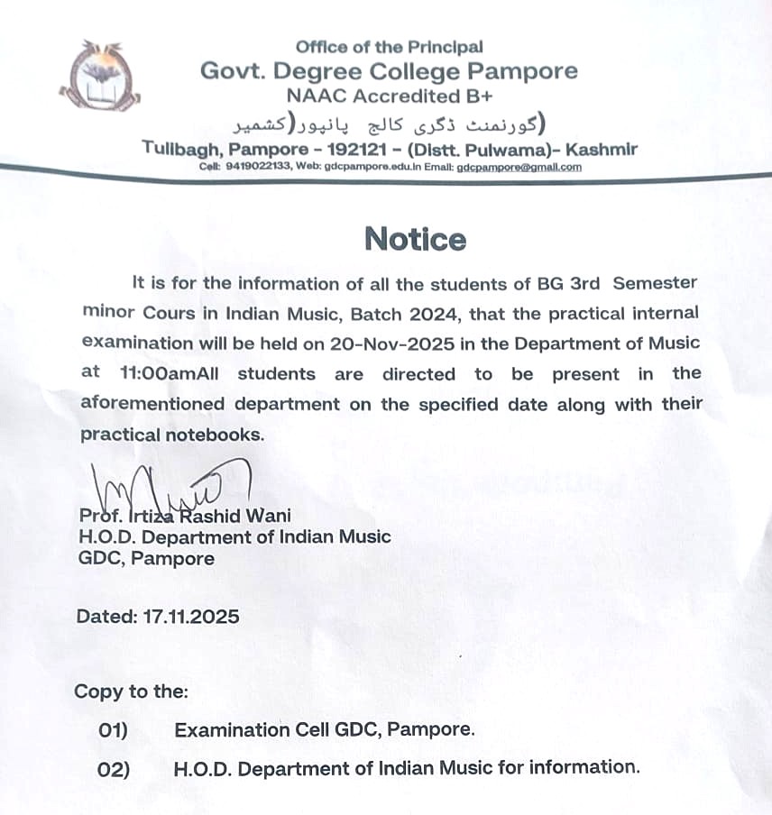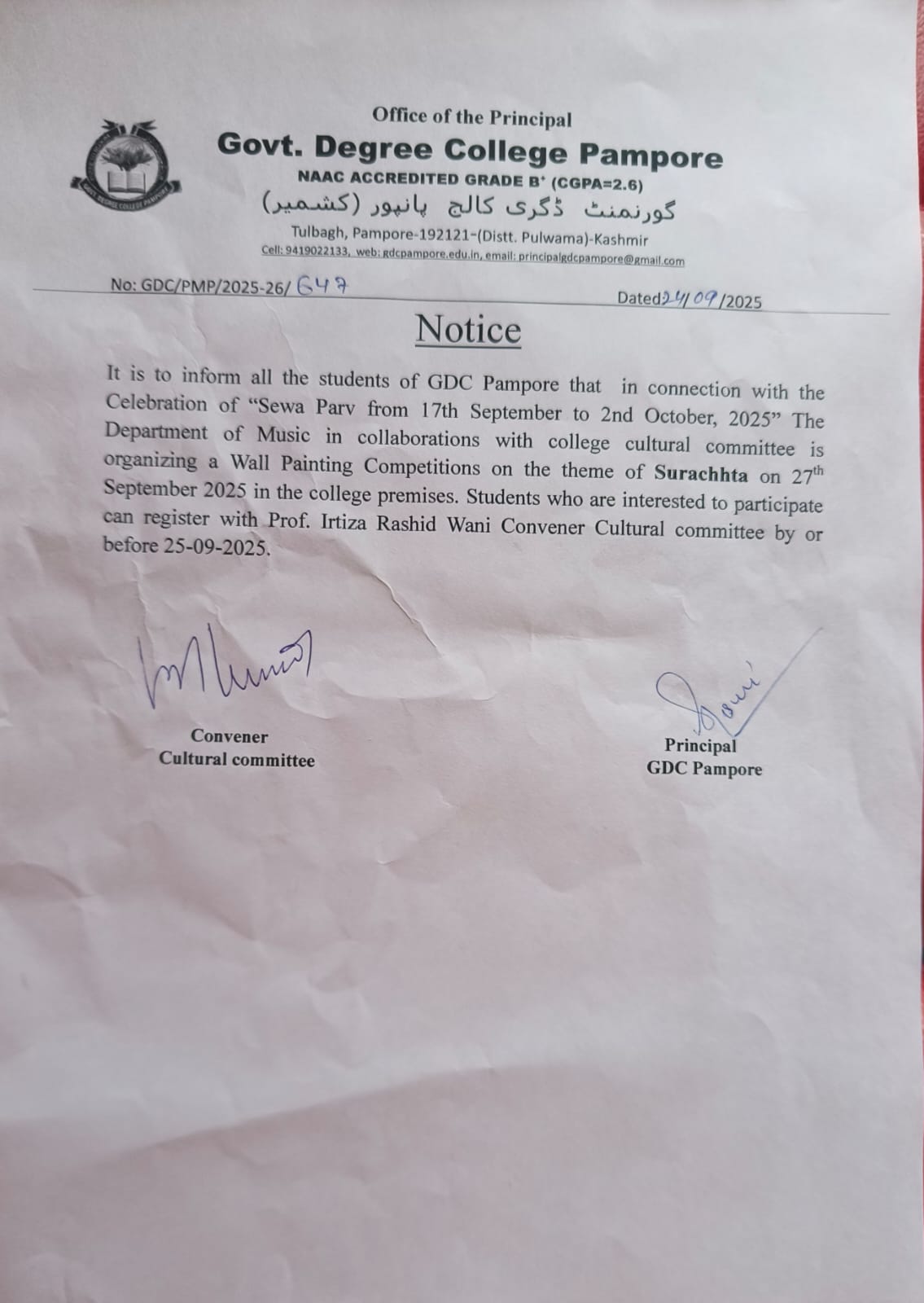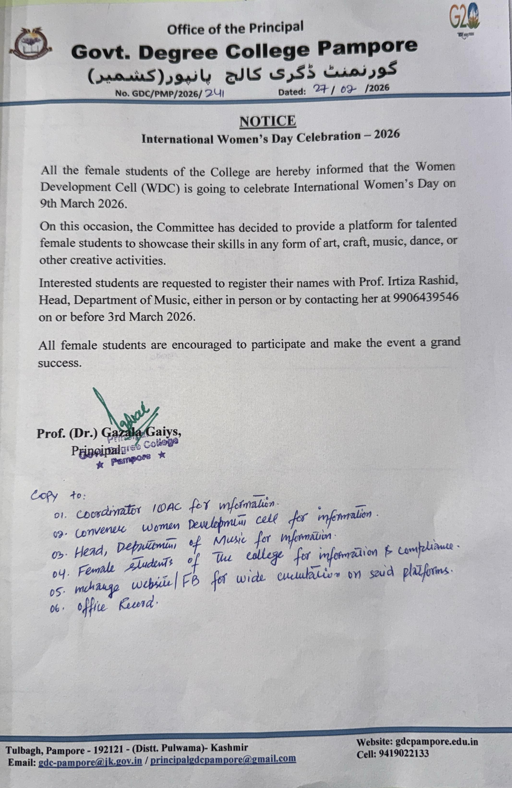 Govt. Degree College, Pampore was established in 2011 and is affiliated to University of Kashmir. Presently the college offers admission to four year undergratuate programs (3+1) in Arabic, Chemistry, Commerce, Economics, EVS, Education, English Literature, Geography, History, Music, Islamic Studies, Kashmiri, Political Science, Physics, Psychology, Sociology, Urdu, Zoology, following NEP curriculum. In these past thirteen years the college has grown rapidly. Infrastructural expansion has taken place in terms of establishment of Virtual Lab, Computer lab., Smart classrooms, Browsing centr