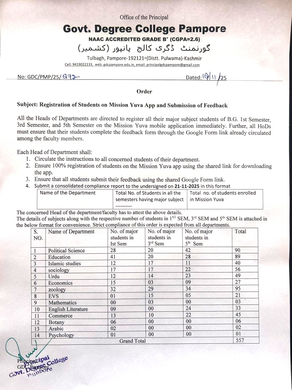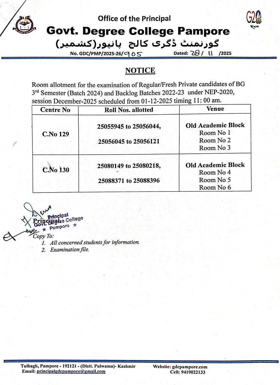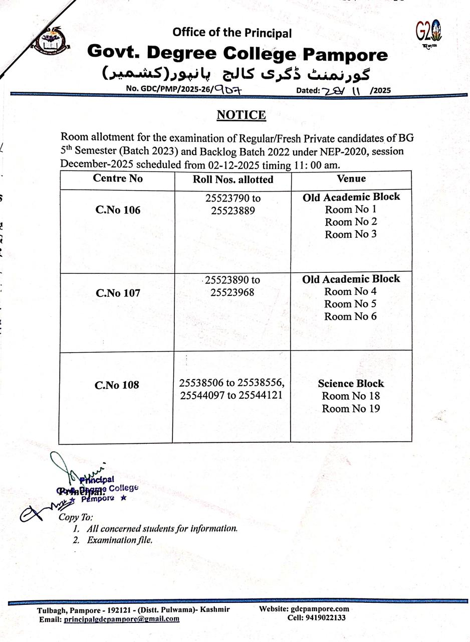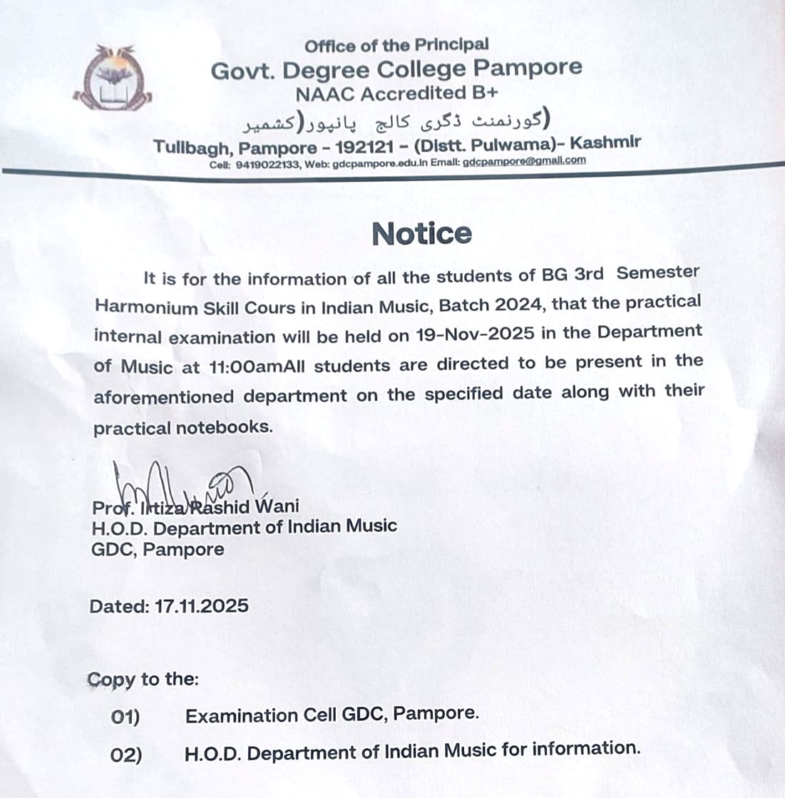 Govt. Degree College, Pampore was established in 2011 and is affiliated to University of Kashmir. Presently the college offers admission to four year undergratuate programs (3+1) in Arabic, Chemistry, Commerce, Economics, EVS, Education, English Literature, Geography, History, Music, Islamic Studies, Kashmiri, Political Science, Physics, Psychology, Sociology, Urdu, Zoology, following NEP curriculum. In these past thirteen years the college has grown rapidly. Infrastructural expansion has taken place in terms of establishment of Virtual Lab, Computer lab., Smart classrooms, Browsing centr